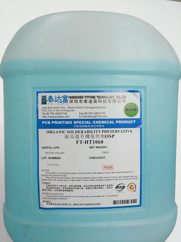 主頁 > 產(chǎn)品展示 > OSP藥水系列 > 耐高溫型多次可焊銅面有機保焊劑FT-HT1060